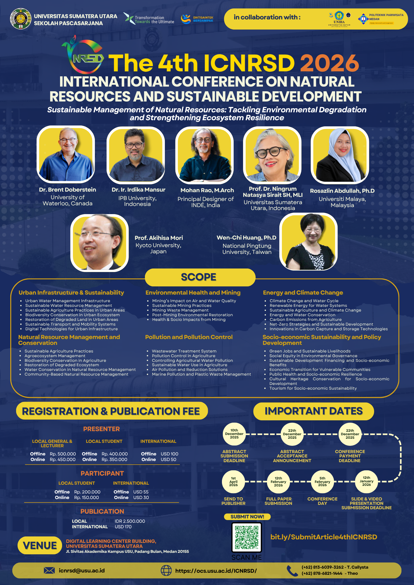 October 24, 2018 – October 25, 2018Faculty of Agriculture, Universitas Sumatera Utara takes great pleasure in welcoming you to Medan, Indonesia during October 24-25 2018 for the second InternationalConference on Agriculture, Environment, and Food Security (AEFS), mainly focusing on the theme "Prospects and Challanges of Sustainable Agriculture to Improve FoodSecurity and Environment". It is one of the leading international conference for presenting novel and application experiences in the fields of agriculture, environment and foodsecurity. It also serves to foster communication among scientist, researchers, scholars, resource managers, practitioners, students, policy makers and all those interested inagricultural and environmental sciences and food security from all around the world.