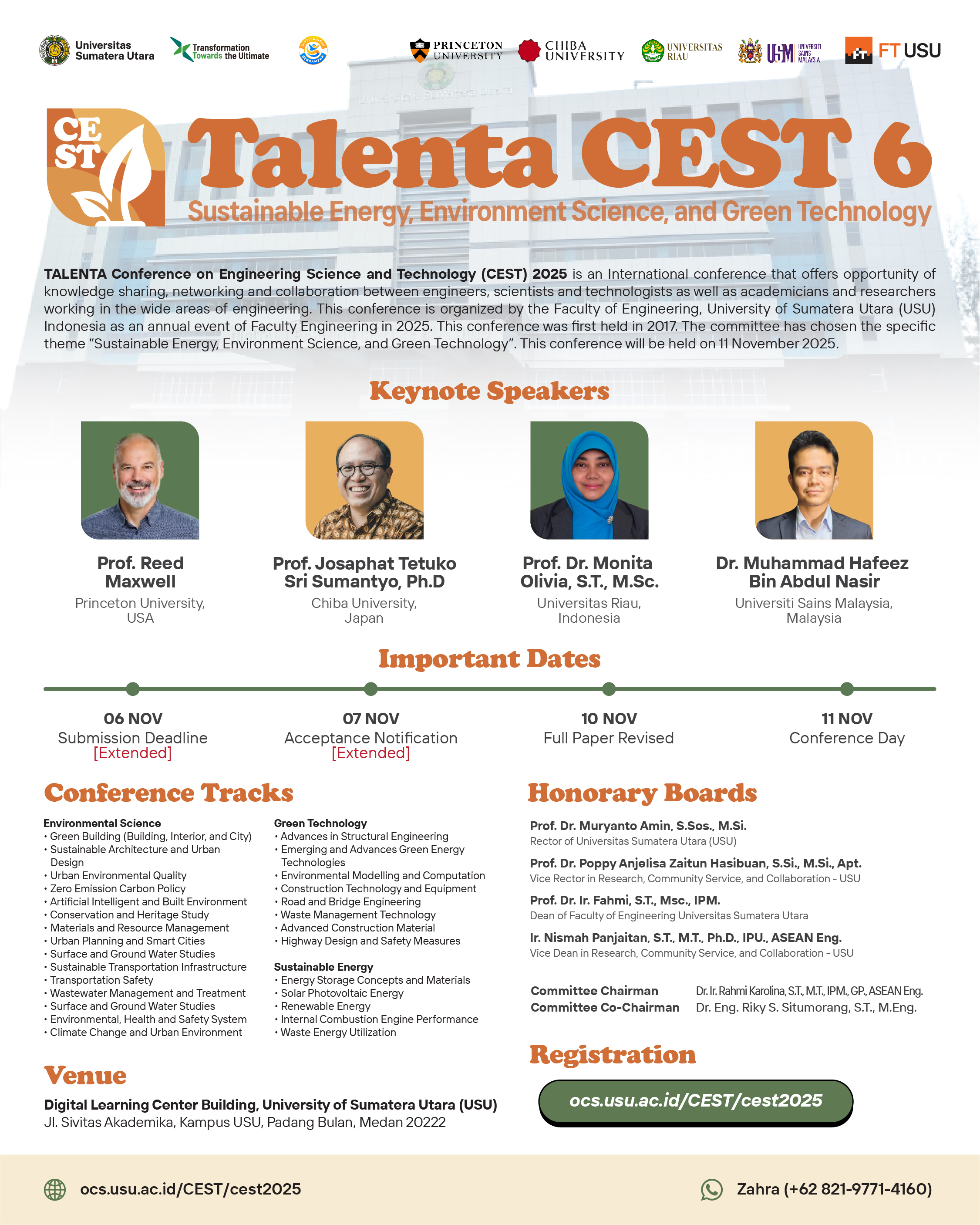 a. USU Rector : Prof. Dr. Muryanto Amin, S.Sos, M.Si b. USU Vice Rector 3 : Prof. Dr. Poppy Anjelisa Zaitun Hasibuan, S.Si, M.Si, Apt c. Head of the USU Research Institute : Prof. Dr. Robert Sibarani, MS d. Secretary of the Research Institute : Prof. Dr. Syafruddin Ilyas, M.Biomed e. Dean of Faculty of Forestry : Prof. Ir. Rudi Hartono, S.Hut., M.Si., IPM f. Vice Dean 1 of Forestry Faculty : Dr. Ir. Alfan Gunawan Ahmad, S.Hut., M.Si g. Vice Dean 2 of Forestry Faculty : Dr. Ir. Pindi Patana, S.Hut, M.Sc h. Vice Dean 3 of Forestry Faculty : Prof. Dr. Ir. Agus Purwoko, S.Hut, M.Si i. Head of Excellence Centre for Bamboo : Dr. Ir. Samsuri, S.Hut., M.Si., IPM., ASEAN Eng. j. USI Rector : Dr. Sarintan Efratani Damanik, S.Hut., M.Si k. USI Dean of Agriculture Faculty : Dr. Roeskani Sinaga, SP., M.Si 2. General Chaira. Chair : Dr. Ir. Samsuri, S.Hut., M.Si., IPM., ASEAN Eng b. Co-Chair : Dr. Ars. Ahmad Delianur Nasution, ST., MT., IAI, GP c. Program/Technical Coordinator : Dr. Ir. Tito Sucipto, S.Hut., M.Si., IPU., ASEAN Eng. Members : 1. Dr. Iwan Risnasari, S.Hut., M.Si 2. Ir. Rahmi Karolina, ST., MT., IPM, GP., ASEAN Eng. 3. Agung Putra Handana, ST., MT 4. Dr. Arvita Netty Br. Sihaloho, SP. MP 3. Liaisona. Chair : Dr. Anita Zaitunah, S.Hut., M.Sc. Members : 1. Prof. Dr. Arida Susilowati, S.Hut., M.Si 2. Prof. Dr. Delvian, SP, MP 3. Meylida Nurrahmania, S.Hut., M.Si 4. Wahyunita Sitinjak, SP., MP 5. Prof. Dr. Budi Utomo, SP., MP 6. Prof. Dr. Ir. Yunasfi, M.Si 4. Local Committee:a. Coordinator : Dr. Ir. Luthfi Hakim, S.Hut., M.Si., IPU., ASEAN Eng. b. Co-Coordinator : Dr. Evalina Herawati, S.Hut., M.Si c. Secretary : 1. Dr. Agr. Faujiah Nurhasanah Ritonga, S.Hut., M.Si 2. Deanova Frestiana Br. Pelawi., S.Hut., M.Sc d. Treasurer : 1. Harisyah Manurung, S.Hut., M.Si 2. Suri Fadilla, S.Hut., M.Sc e. Publicity : 1.Sony Eka Nugraha, S.Farm., M.Si Apt. (Coordinator) 2. Dr. Bejo Slamet, S.Hut., M.Si 3. Ahmad Baiquni Rangkuti, S.Hut., M.Si 4. Handayani Saragih, SP., M.Sc 5. Nur Hidayat, S.Hut f. Members : 1. Dwiki Ananda Habibi, S. Kom 2. Wahyuni Pulungan, S.Hut 3. Ida Mallia Ginting, S.Hut 4. Scientific Committee : 1. Prof. Dr. Apri Heri Iswanto, S.Hut., M.Si (Coordinator/ Universitas Sumatera Utara, Indonesia) 2. Lee Seng Hua, Ph.D (Universiti Teknologi Mara, Malaysia) 3. Rangabhashiyam Selvasembian, Ph.D (SRP University, India) 4. Prof. Weihua Xu (Chinese Academy of Sciences, China) 5. Prof. Tomasz Rogozinski (Poznan University of Life Sciences, Poland) 6. Prof. Dr. Widya (National Research and Innovation Agency, Indonesia) 7. Dr. M. Adly Rahandi Lubis (National Research and Innovation Agency, Indonesia) 8. Dr. Wahyu Hidayat (Universitas Lampung, Indonesia) 9. Prof. Dr. Naresworo Nugroho, M.Sc (IPB University, Indonesia) 10. Prof. Dr. Ragil Widyorini (Universitas Gadjah Mada, Indonesia) 11. Prof. Petar Antov (University of Forestry, Bulgaria) 12. Prof. Dr. Ganis Lukmandaru (Universitas Gadjah Mada, Indonesia) 13. Prof. Dr. Faisal Danu Tuheteru (Universitas Haluoleo, Indonesia) 14. Prof. Dr. Syamsu Rijal (Universitas Hasanudin, Indonesia) 15. Dr. Desi Ekawati (Ministry of Forestry, Indonesia) 16. Dr. Jajang Sutiawan (National Research and Innovation Agency, Indonesia) 17. Dr. Sugeng Budiharta (National Research and Innovation Agency, Indonesia) 18. Dr. Wanda Kuswanda (National Research and Innovation Agency, Indonesia) 19. Prof. Dr. Zulfahmi (UIN Syarif Kasim, Indonesia) 20. Prof. Dr. Jeriels Matatula, (Politeknik Negeri Kupang, Indonesia) 21. Dr. FX. Dako (Politeknik Negeri Kupang, Indonesia) 22. Dr. Sukadaryati (National Research and Innovation Agency, Indonesia) 23. Dr. Lum Wei Chan (University Malaysia Kelantan, Malaysia) 24. Dr. Andi Hermawan (University Malaysia Kelantan, Malaysia) 25. Daruk Ary Adriansyah Samsura, Ph.D (Radboud Univerity, The Netherland) 26. Thomas Groen, Ph.D (Twente University, The Netherland) 27. Prof. Yanqiu Xing (Northeast Forestry University Harbin, China). 28. Prof. Dr. Margaretha Rahayu Ningsih (Universitas Negeri Semarang, Indonesia) 5. Excursion Committee: a. Coordinator : Rozalina, S.Hut., M.Si b. Co-Coordinator : Dr. Ummu Harmain, SP., M.Si c. Members : 1. Pm. Novdin Manoktong Sianturi, ST., MM., Ph.D 2. Dr. Ir. Jef Rudianta Saragih, M.Si 3. Dr. Ir. Simon Sidabukke., M.Si 4. Hamzah Siregar, S.Hut 5. Rizka Amelia, S.Hut 6. International Community Service a. Coordinator : Dr. Ridahati Rambey, S.Hut., M.Si b. Secretary Dr. Deni Elfiati, SP., MP c. Members Dr. Ridwanti Batubara, S.Hut., MP