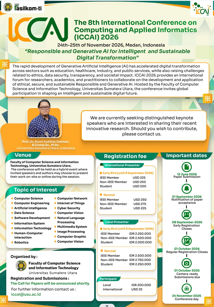Hosted by the Master of Business, Postgraduate School, Universitas Sumatera Utara, in collaboration with Universiti Teknologi MARA Pulau Pinang Branch, and with seven international universities from Türkiye, Uzbekistan, and Indonesia, IJCDSS 2025 provides a dynamic platform for exploring cutting-edge research and practical applications in fields such as business, management, education, communication, and digital entrepreneurship. The conference encourages interdisciplinary discussions and the exchange of ideas that address pressing global challenges while fostering resilience and sustainability in diverse sectors.